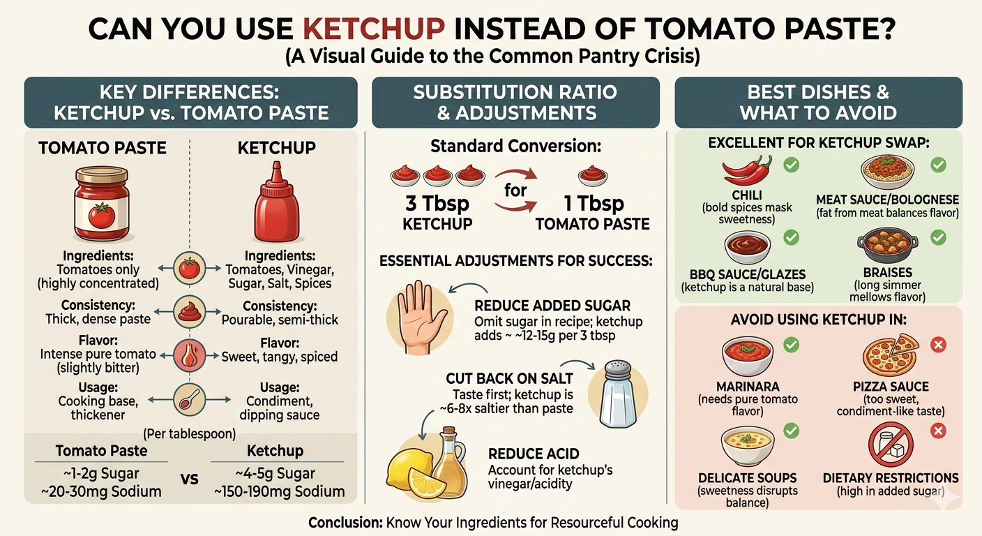 এই নির্দেশিকাটি আপনাকে ঠিক কখন এবং কীভাবে ব্যবহার করতে হবে তার মধ্য দিয়ে চলে কেচাপ instead of tomato paste , সঠিক রূপান্তর অনুপাত, কী সামঞ্জস্য করতে হবে, কোন খাবারগুলি অদলবদল সবচেয়ে ভাল সহ্য করে এবং কোনটি হয় না — যাতে আপনি আপনার প্যান্ট্রি স্ট্যাপল হাতে না রেখেও আত্মবিশ্বাসের সাথে রান্না করতে পারেন৷